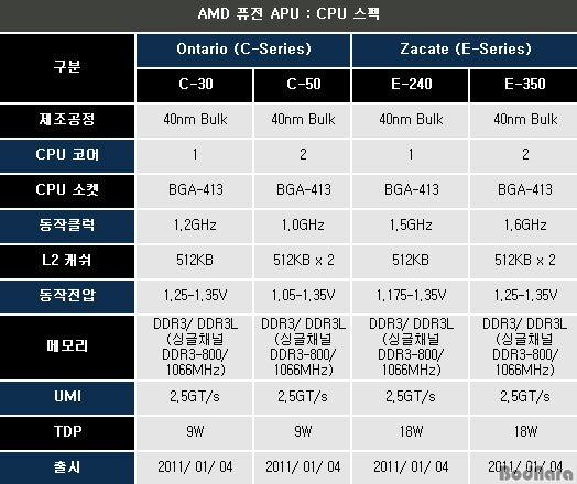 ¿ÂŸ¸®¿À (Ontario)/ ÀÚÄ«Å× (Zacate) APU´Â SSE/ SSE2/ SSE3/ SSSE3/ NX bit/ AMD64¸¦ Áö¿øÇϸç, ÀÚÄ«Å× E-350Àº DDR3/ DDR3L ½Ì±Ûä³Î°ú DDR3-1066MHzÀÇ Å¬·°À» Áö¿øÇÑ´Ù. ¿ÂŸ¸®¿À´Â C ½Ã¸®Áî·Î C30/ C-50ÀÇ 2°¡Áö ¶óÀξ÷À¸·Î °¢°¢ ½Ì±ÛÄÚ¾î¿Í µà¾óÄÚ¾î·Î ³ª´µ¸ç, 9W TDP ½ºÆåÀ» °¡Áø´Ù. ÀÚÄ«Å×´Â E ½Ã¸®Áî·Î E-240 ½Ì±ÛÄÚ¾î¿Í E-350 µà¾óÄÚ¾îÀÇ 2°¡Áö·Î ³ª´µ¸ç, µ¿ÀÛŬ·°¿¡ Â÷À̰¡ ÀÖ°í TDP ½ºÆåÀº 18W·Î °°´Ù.