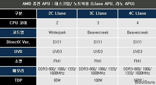 2011³â 3ºÐ±â ÁßÀ¸·Î µîÀåÀÌ ¿¹»óµÇ°í ÀÖ´Â Ç»Àü APU´Â µ¥½ºÅ©Å¾¿ë°ú ³ëÆ®ºÏ¿ëÀÌ Àִµ¥ µà¾óÄÚ¾î¿Í Æ®¸®ÇÃÄÚ¾î, ±×¸®°í ÄõµåÄÚ¾î ¹öÀüÀÌ ¸ðµÎ Æ÷ÇԵǸç, DirectX 11 Áö¿ø ±×·¡ÇÈÄÚ¾î¿Í UVD3 ¿£ÁøÀ» ³»ÀåÇÑ´Ù. µà¾óÄÚ¾î´Â 65W TDP, Æ®¸®ÇÃÄÚ¾î¿Í ÄõµåÄÚ¾î´Â 100W TDP¸¦ Á¦°øÇÒ °ÍÀ¸·Î ¾Ë·ÁÁ® ÀÖ´Ù.