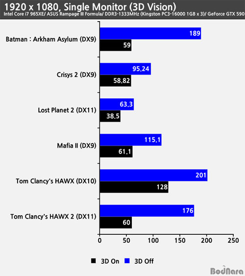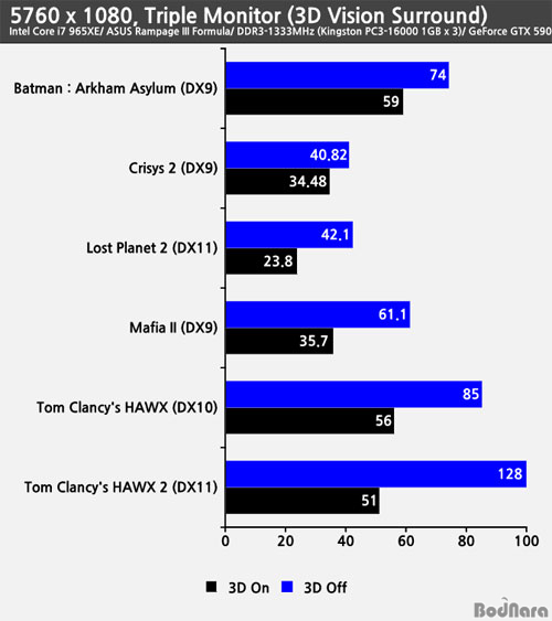 ÁöÆ÷½º GTX 590Àº ¼¶ó¿îµå ±¸¼º½Ã ÇÁ·¹ÀÓÀÌ °ÔÀÓ¿¡ µû¶ó Àý¹Ý ÀÌ»óÀ¸·Î Ç϶ôµÇ´Â ¸ð½ÀÀ» º¸¿©ÁÖ¾ú´Âµ¥ 3D ºñÀüÀ» ÀÌ¿ëÇßÀ» ¶§ ¿ª½Ã °ÔÀÓ¿¡ µû¶ó Àý¹Ý ÀÌ»óÀ¸·Î Ç϶ôµÇ¾ú´Ù. ¿©±â¿¡ ÇØ»óµµ°¡ ´Ã¾î³ª´Â 3D ºñÀü ¼¶ó¿îµå ȯ°æÀ» ±¸ÃàÇÒ °æ¿ì 3D ºñÀü¸¸ Ȱ¿ëÇßÀ» ¶§º¸´Ù °ÔÀÓ¿¡ µû¶ó Àý¹Ý ÀÌ»óÀÇ ÇÁ·¹ÀÓÀÌ Ç϶ôµÇ´Â °ÍÀ¸·Î È®ÀεȴÙ.