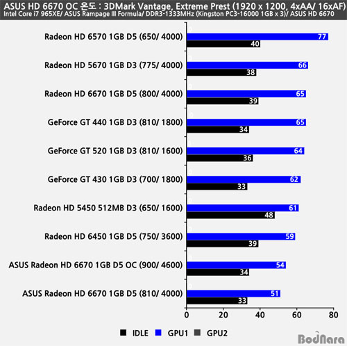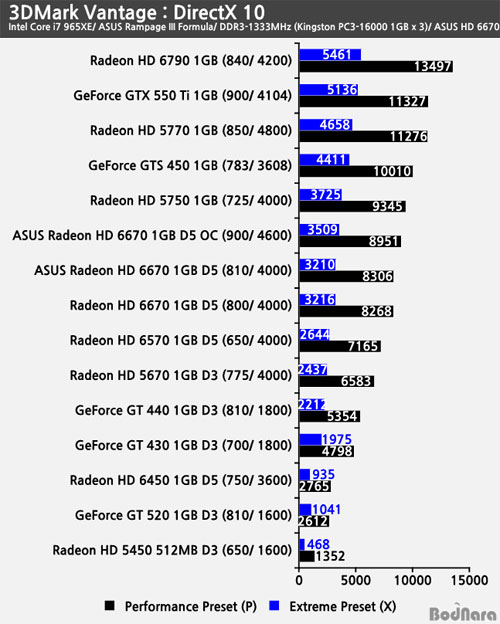ASUS ¶óµ¥¿Â HD 6670Àº ·¹ÆÛ·±½º ¶óµ¥¿Â HD 6670°ú ºñ±³ÇØ ÄÚ¾î Ŭ·°ÀÌ 810MHz·Î 10MHz°¡ ´õ ³ô°Ô ¼³Á¤µÈ ¹öÀüÀ¸·Î ¾à°£ÀÇ ¿À¹öŬ·° Àû¿ëµÇ¾ú´Ù. DX10 ±â¹ÝÀÇ ±×·¡ÇÈÄ«µåÀÇ ¼º´ÉÀ» ºñ±³ÇÒ ¼ö ÀÖ´Â 3DMark VantageÀÇ ½ºÄÚ¾î´Â ÆÛÆ÷¸Õ½º ÇÁ¸®¼Â¿¡¼´Â ASUS ¶óµ¥¿Â HD 6670ÀÌ ·¹ÆÛ·±½ºº¸´Ù ¼ÒÆø Áõ°¡ÇÑ ½ºÄھ Á¦°øÇßÀ¸³ª ÀͽºÆ®¸² ÇÁ¸®¼Â¿¡¼´Â ¿ÀÈ÷·Á ¿ÀÂ÷¹üÀ§³»·Î ½ºÄھ ÁÙ¾ú´Ù. Âü°í·Î Extreme PresetÀº 1920 x 1200, 4xAA/ 16xAF, Performance PresetÀº 1280 x 1024, 1xAA/ NoAF ¼³Á¤ÀÌ Àû¿ëµÈ´Ù.