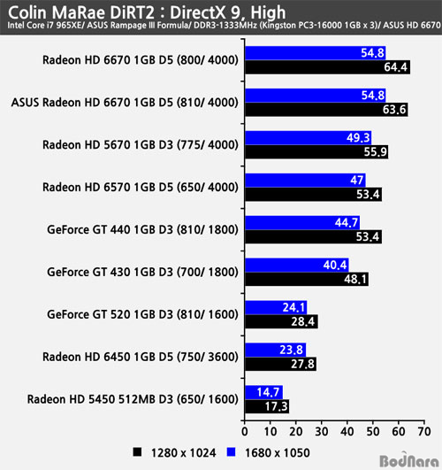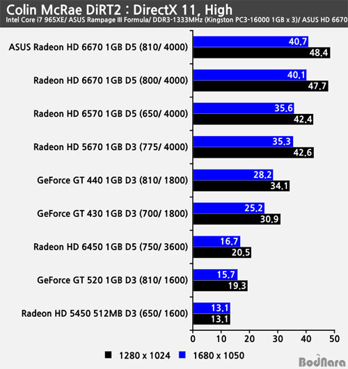 Äݸ° ¸Æ·¹ÀÌ ´õÆ®2 (Colin McRae DiRT2) °ÔÀÓÀº DirectX 9¿Í DirectX 11À» ¸ðµÎ Áö¿øÇÏ´Â °ÔÀÓÀ¸·Î ¿©±â¿¡¼´Â DX9 ±â¹ÝÀÇ ¼º´ÉÀ» ºñ±³Çߴµ¥ ASUS ¶óµ¥¿Â HD 6670Àº ÄÚ¾î Ŭ·°ÀÌ 10MHz ³ôÀº 810MHz°¡ ¼³Á¤µÇ¾úÀ¸³ª AA ¹ÌÀû¿ë½Ã´Â ·¹ÆÛ·±½ºº¸´Ù ¿ÀÂ÷¹üÀ§·Î ÀúÇØ»óµµ¿¡¼ ÇÁ·¹ÀÓÀÌ ³·¾Ò°í 4xAA Àû¿ë½Ã¿¡´Â ÇÁ·¹ÀÓÀÌ ±Ù¼ÒÇÏ°Ô Çâ»óµÇ¾ú´Ù.