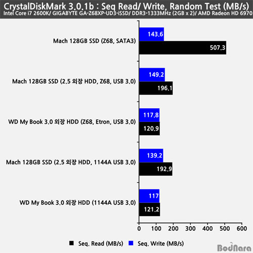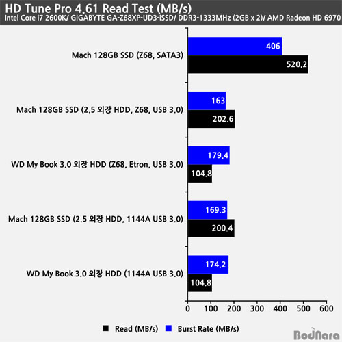 HD Tune 4.61ÀÇ ¼øÂ÷Àбâ Å×½ºÆ®¿¡¼ ÀÎÅÚ Z68 ¸ÞÀκ¸µåÀÇ USB 3.0 ÄÁÆ®·Ñ·¯¿Í ÇÏÀÌÆ÷ÀÎÆ® RU1144A È®Àå Ä«µå ¸ðµÎ ¼·Î Àб⠼º´É Â÷ÀÌ´Â ³ªÅ¸³»Áö ¸øÇß´Ù. ÀÌ´Â »ç¿ëµÈ SSD (MX-DS Turbo SSD 128GB, ¼øÂ÷Àбâ 555MB/s, ¼øÂ÷¾²±â 510MB/s, SATA3 Áö¿ø)°¡ ³×ÀÌÆ¼ºê·Î USB 3.0À» Áö¿øÇÏ´Â °ÍÀÌ ¾Æ´Ï¶ó º°µµÀÇ 2.5ÀÎÄ¡ USB 3.0 ¿ÜÀå HDD¸¦ Ãß°¡·Î ¿¬°á, ´Ù½Ã ÇÏÀÌÆ÷ÀÎÆ® RU1144A È®Àå Ä«µåÀÇ USB 3.0 ÄÁÆ®·Ñ·¯¸¦ °ÅÃÄ »ç¿ì½ººê¸´Áö·Î ¿¬°áµÇ¸é¼ ´ë¿ªÆø ¼Õ½ÇÀÌ ¹ß»ýµÇ¹Ç·Î °í¼ÓÀÇ SSD ¼º´ÉÀ» Á¦´ë·Î ³»ÁÖÁö ¸øÇÑ´Ù. ÀÌ´Â ¸ÞÀκ¸µåÀÇ USB 3.0 ÄÁÆ®·Ñ·¯ ¿ª½Ã ¸¶Âù°¡Áö·Î ¿Âº¸µå USB 3.0 ÄÁÆ®·Ñ·¯¿Í ÀÎÅÚ Z68 Ĩ¼ÂÀ» °ÅÄ¡¸é¼ ±×¸¸Å ¼Õ½ÇÀÌ ¹ß»ýµÈ´Ù. ³×ÀÌÆ¼ºê ¹æ½Ä¿¡¼´Â À̺¸´Ù ¼º´É ÀúÇÏ Á¤µµ°¡ ÁÙ¾îµé °ÍÀ¸·Î ¿¹»óµÈ´Ù.