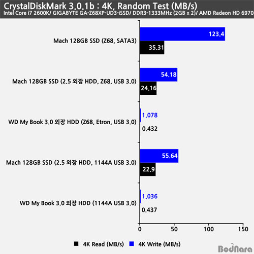 CrystalDiskMarkÀÇ ·£´ý Å×½ºÆ®¿¡¼µµ ¼øÂ÷Àбâ¿Í ¾²±â, ´Ù¼öÀÇ ¸¹Àº ÆÄÀÏÀ» ´Ù·ç´Â 4K Àбâ¿Í ¾²±â ¼º´É ¿ª½Ã ¸ÞÀκ¸µå USB 3.0°ú ÇÏÀÌÆ÷ÀÎÆ® RU1144A ÄÁÆ®·Ñ·¯ »çÀÌÀÇ ¼º´É Â÷ÀÌ´Â °ÅÀÇ ¾ø´Â °ÍÀ¸·Î È®ÀεȴÙ. ´Ù¸¸, USB 3.0 ¿¬°á½Ã ¼øÂ÷Àб⠼º´ÉÀº SATA3 ´Üµ¶ ¿¬°áº¸´Ù ³·Àº ¼º´ÉÀ̾úÀ¸³ª ¼øÂ÷¾²±â´Â SATA3 ¿¬°á°ú Â÷À̾ø´Â ¼º´ÉÀ» ³»ÁÖ´Â °ÍÀ¸·Î È®ÀεȴÙ. ÀÌ´Â °í¼ÓÀÇ Àб⺸´Ù ·£´ý ¾²±â´Â USB 3.0ÀÇ ´ë¿ªÆø ¹üÀ§ ³»¿¡¼ 󸮰¡ °¡´ÉÇϱ⠶§¹®À¸·Î º¸¿©Áø´Ù.