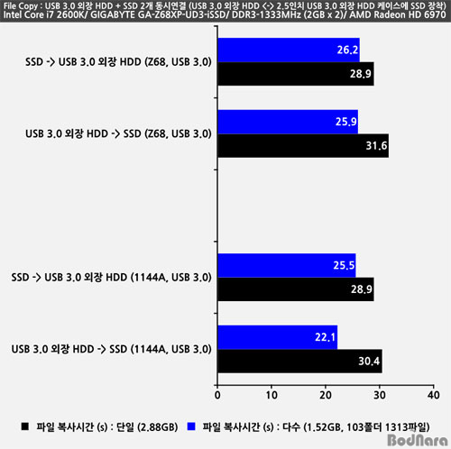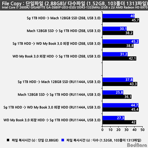 ÆÄÀϺ¹»ç Å×½ºÆ®´Â ´ÜÀÏÆÄÀÏ (2.88GB)°ú ´Ù¼ö ÆÄÀÏ (1.52GB, 103Æú´õ/ 1313ÆÄÀÏ)À» °¢°¢ ÀÌ¿ëÇØ ÁøÇàÇßÀ¸¸ç, ¾Õ¼¿Í °°ÀÌ ¸ÞÀκ¸µå USB 3.0 ÄÁÆ®·Ñ·¯¿Í ÇÏÀÌÆ÷ÀÎÆ® RU1144A È®Àå Ä«µå¸¦ ÀÌ¿ëÇß´Ù. ¶ÇÇÑ, °¢ ÀåÄ¡ÀÇ ´ÜÀÏ ¿¬°á ¿Ü¿¡µµ ´ë¿ªÆøÀÌ °øÀ¯µÇ´Â ȯ°æÀ» °í·ÁÇØ WD My Book 3.0 1TB USB 3.0 ¿ÜÀå HDD¿Í SSD¸¦ 2.5ÀÎÄ¡ USB 3.0 ¿ÜÀå HDD ÄÉÀ̽º¿¡ ÀåÂø ÈÄ 2°³ÀÇ ÀåÄ¡¸¦ µ¿½Ã¿¡ ¿¬°áÇØ Å×½ºÆ®¸¦ ÁøÇàÇß´Ù.