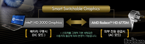 HP ÆÄºô¸®¿Â dv6-6124TXÀÌ Á¦°øÇÏ´Â ½ºÀ§ÃÄºí ±×·¡ÇÈ ±â¼úÀº ¹èÅ͸®·Î ±¸µ¿µÉ °æ¿ì¿¡´Â ³»Àå ±×·¡ÇÈÀÎ ÀÎÅÚ HD 3000 ±×·¡ÇȽº°¡ »ç¿ëµÇ°í Àü¿ø ¾î´ðÅ͸¦ ¿¬°áÇØ ¿ÜºÎ Àü¿øÀ» °ø±Þ ¹ÞÀ» ¶§¿¡´Â ÀÚµ¿À¸·Î AMD ¶óµ¥¿Â HD 6770MÀÌ »ç¿ëµÇ´Â ¹æ½ÄÀÌ´Ù.