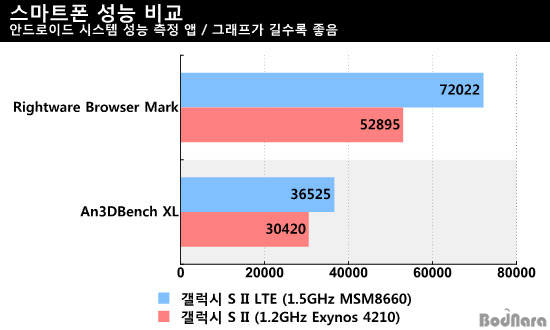 Rightware BrowserMark¸¦ ÅëÇÑ À¥ ºê¶ó¿ì¡ ¹× ¸ÖƼ¹Ìµð¾î ¼º´É ÃøÁ¤, An3DBench XLÀ» ÀÌ¿ëÇÑ 3D ±×·¡ÇÈ ¼º´É ÃøÁ¤ Å×½ºÆ®´Â 1.5GHz Ŭ·°À¸·Î µ¿ÀÛÇÏ´Â Ä÷ÄÄ ÇÁ·Î¼¼¼°¡ µé¾î°£ °¶·°½Ã S II LTE°¡ ³ô°Ô ÃøÁ¤µÈ´Ù.