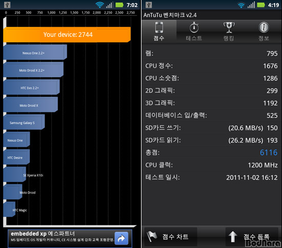 1.2GHz µà¾óÄÚ¾î TI OMAP4430 ÇÁ·Î¼¼¼°¡ µé¾î°£ ·¹ÀÌÀúÀÇ ¼º´ÉÀº Quadrant ±âÁØÀ¸·Î´Â 2500Á¡´ë~2800Á¡´ë Á¤µµ, AnTuTu º¥Ä¡¸¶Å©¿¡¼´Â 6000Á¡´ë ÃʹÝÀ» ±â·ÏÇß´Ù. 1.5GHz Ä÷ÄÄ ½º³Àµå·¡°ï ÇÁ·Î¼¼¼¸¦ »ç¿ëÇÏ´Â ½º¸¶Æ®Æù°ú ºñ½ÁÇϰųª Á¶±Ý ¾Õ¼´Â °á°ú´Ù.