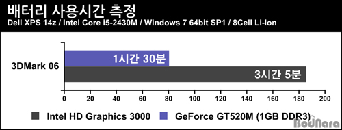 ÁöÆ÷½º GT520MÀ» »ç¿ëÇÒ °æ¿ì ³»Àå ±×·¡ÇÈ¿¡ ºñÇØ ¼ÒºñÀü·ÂÀÌ 30% °¡·® Áõ°¡ÇÏÁö¸¸ ¼º´ÉÀº 2¹è°¡ ³Ñ°Ô Çâ»óµÇ±â ¶§¹®¿¡ °á°úÀûÀ¸·Î Àü·Â´ëºñ ¼º´É¿¡¼´Â ºÐ¸íÇÑ ÀÌÁ¡À» °®´Â °Íµµ »ç½ÇÀÌ´Ù. ¹°·Ð NVIDIA ¿ÉƼ¸Ó½º¸¦ ÅëÇØ ÀÚµ¿À¸·Î »óȲ¿¡ ¸ÂÃç ±×·¡ÇÈÀ» ÀüÈ¯ÇØÁֱ⠶§¹®¿¡ ´õ¿í Çâ»óµÈ Àü·Â È¿À²À» Á¦°øÇÒ ¼ö ÀÖ´Â °Íµµ ÀåÁ¡À̶ó°í ÇÒ ¼ö ÀÖ´Ù.