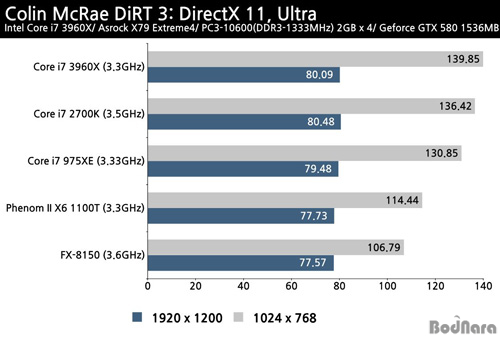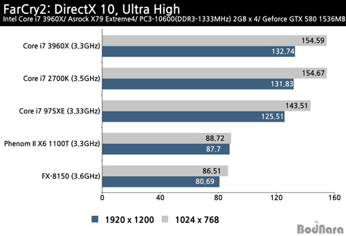 1200)¿Í CPUÀÇ ¿µÇâÀÌ Å« ÀúÇØ»óµµ(1024 x 768) ¸ðµÎ ÄÚ¾î i7 3960X ½Ã½ºÅÛÀº ÄÚ¾î i7 2700K ½Ã½ºÅÛ°ú ¿ÀÂ÷ ¹üÀ§·Î º¼ ¼ö ÀÖ´Â 1 ÇÁ·¹ÀÓ ¹Ì¸¸ÀÇ ¼º´É Â÷À̸¸ º¸¿´À¸¸ç, ÄÚ¾î i7 975XE ½Ã½ºÅÛ°ú´Â °íÇØ»óµµ¿¡¼ 5.3%, ÀúÇØ»óµµ¿¡¼ 7.1% ´õ ³ôÀº ¼º´ÉÀ» º¸¿´´Ù.