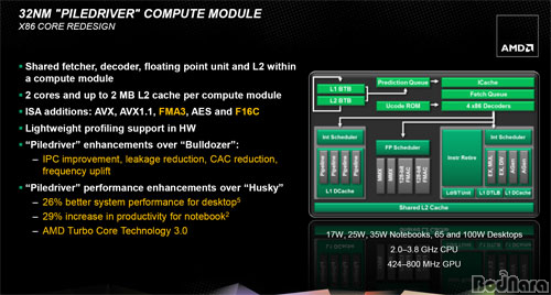 µ¥½ºÅ©Å¾ ºÒµµÀú FX CPU°¡ ÃÖ´ë 8Äھ ±¸¼ºÇÑ °Í°ú ´Þ¸® CPU¿Í GPU ÅëÇÕ¿¡ µû¸¥ Àü·Â ¼Ò¸ð¸¦ °í·Á, ÃÖ´ë 4Äھ Æ®¸®´ÏƼ APU¿¡ žÀçÇÑ´Ù. ¼º´É Çâ»óÀ» À§ÇØ »ç¿ëµÈ L3 ij½¬´Â Á¦¿ÜµÇ¾ú´Ù. ¸ðµâ ´ç 2ÄÚ¾î¿Í ÃÖ´ë L2 2MB¸¦ Á¦°øÇϸç, ÆäÄ¡¿Í µðÄÚ´õ, ºÎµ¿¼Ò¼öÁ¡ À¯´Ö, L2 ij½¬´Â °øÀ¯ÇÑ´Ù.