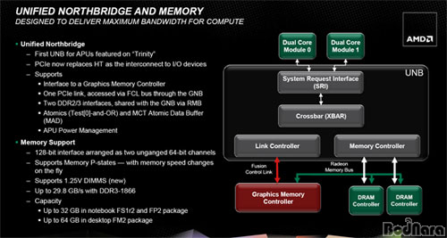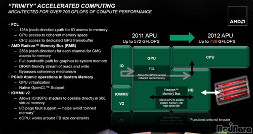 ÆÄÀϵå¶óÀ̹ö¸¦ ±â¹ÝÀ¸·Î ÇÑ Æ®¸®´ÏƼ APU´Â ³ë½ººê¸´Áö¿Í ¸Þ¸ð¸® ¿¬°è¼º, ÄÄÇ»ÆÃ °¡¼ÓÀ» À§ÇÑ ¸¹Àº ºÎºÐÀ» °³¼±Çß´Ù. PCIe ÀÎÅÍÆäÀ̽º¸¦ ÅëÇØ HT¿Í I/O¸¦ ´ëüÇϸç, IO¿¡¼ ¸Þ¸ð¸® ¿¢¼¼½º°¡ °¡´ÉÇÑ 128b ÀÎÅÍÆäÀ̽ºÀÎ FCLÀ» Á¦°øÇÑ´Ù. GPU´Â ¸Þ¸ð¸® °ø°£À» °øÀ¯Çϸç, CPUµµ GPU ÇÁ·¹ÀÓ ¹öÆÛ¸¦ ¾×¼¼½ºÇÒ ¼ö ÀÖµµ·Ï ÇØÁØ´Ù.