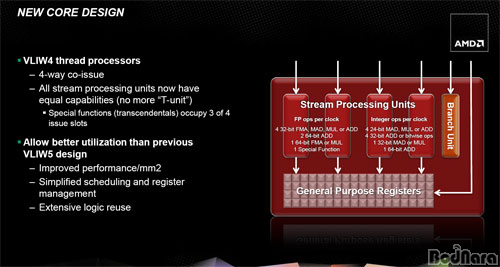 VLIW4 (4-Way VLIW) ¾ÆÅ°ÅØÃ³´Â VLIW5 (5-Way VLIW) ¾ÆÅ°ÅØÃ³¿¡ »ç¿ëµÈ T-unitÀ» Á¦°øÇÏÁö ¾Ê´Â ´ë½Å ¸ðµç ½ºÆ®¸² ÇÁ·Î¼¼¼ À¯´ÖÀÌ ÀÌ ±â´ÉÀ» ´ã´çÇϸç, mm^2´ç ¼º´É Çâ»ó, ½ºÄÉÁ층 ¹× ·¹Áö½ºÅÍ °ü¸® ´Ü¼øÈ, ·ÎÁ÷ Àç»ç¿ë È®Àå µîÀ» ÅëÇØ ¼º´É°ú È¿À²À» °³¼±ÇÑ´Ù.