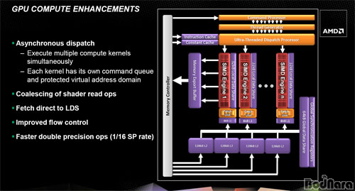 VILW4 ¾ÆÅ°ÅØÃ³´Â GPGPU¸¦ À§ÇÑ GPU ÄÄÇ»ÆÃ ¼º´É °³¼±À» À§ÇØ ºñµ¿±â µð½ºÆÐÄ¡¸¦ ÅëÇØ µ¿½Ã¿¡ ¸ÖƼ ÄÄǻƮ Ä¿³Î ½ÇÇà Çâ»ó µîÀÌ ÀÌ·ç¾îÁö¸ç, ¸í·É¾î ó¸® È帧 °³¼± ¹× LDS·ÎºÎÅÍ Á÷Á¢ ÆÐÄ¡, ´õºí ÇÁ¸®½ÃÀü (Double Precision) °³¼± (1/16 SP ºñÀ²)µµ ÀÌ·ç¾îÁ³´Ù.