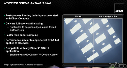 ¶ÇÇÑ DirectCompute¸¦ ÀÌ¿ëÇÑ ±×·¡ÇÈ ÈÄó¸® ±â¹ýÀÎ MLAA (Morphological Anti-Aliasing) ±â¼úÀ» Áö¿øÇÑ´Ù. DX9/ DX10/ DX11°ú ȣȯµÇ¸ç, AMD īŻ¸®½ºÆ® ÄÁÆ®·Ñ ¼¾ÅÍ (Catalyst Control Center)¸¦ ÀÌ¿ëÇØ ÄÑ°í ²ø ¼ö ÀÖ´Ù.