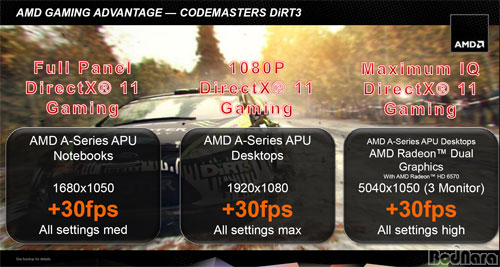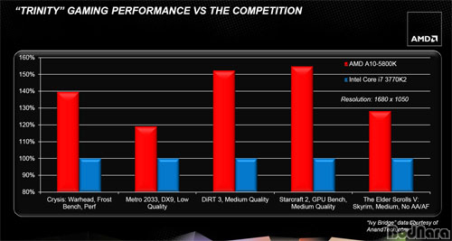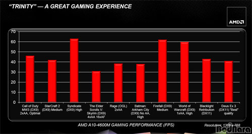µ¥½ºÅ©Å¾¿ë A10 5800K Æ®¸®´ÏƼ APU¿Í ÀÎÅÚ ¾ÆÀ̺ñºê¸´Áö (Ivy Bridge) ÄÚ¾î i7 3770K¿Í 1680 x 1050 ÇØ»óµµ ±âÁؽà ³»Àå ±×·¡ÇÈ ¼º´É ¿ª½Ã ÃÖ´ë 1.5¹è, ³ëÆ®ºÏ A10-4600MÀº 1366 x 768 ÇØ»óµµ¿¡¼ ´Ù¾çÇÑ °ÔÀӵ鿡¼ 30fps ÀÌ»óÀÇ ¼º´ÉÀ» Á¦°øÇÏ´Â °ÍÀ¸·Î AMD ³»ºÎ Å×½ºÆ® °á°ú¸¦ ¼Ò°³Çß´Ù.