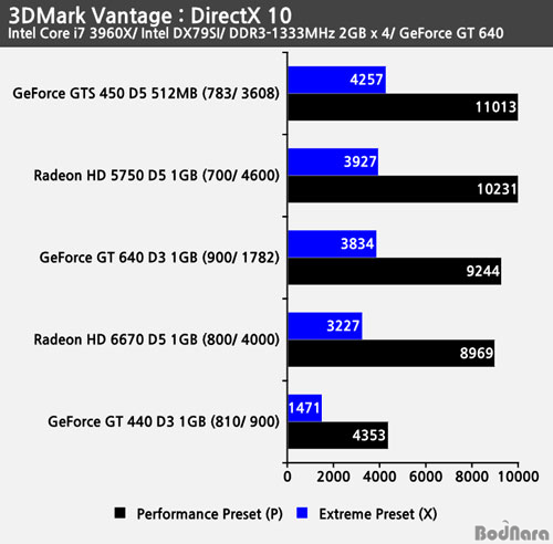 3DMark Vantage´Â DX10 ȯ°æ Å×½ºÆ® ÇÁ·Î±×·¥À¸·Î ÁöÆ÷½º GT 640Àº ÁöÆ÷½º GT 440º¸´Ù ³ôÀº ¼º´É, ÁöÆ÷½º GTX 450¿¡´Â ºÎÁ·ÇÏ°í ¶óµ¥¿Â HD 5750°ú ¶óµ¥¿Â HD 6670 »çÀÌÀÇ ¼º´ÉÀ» Á¦°øÇß´Ù.