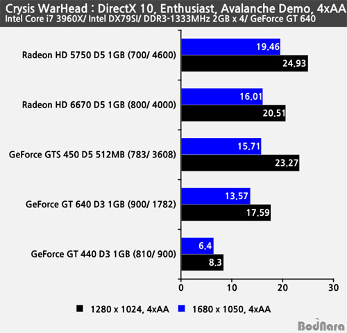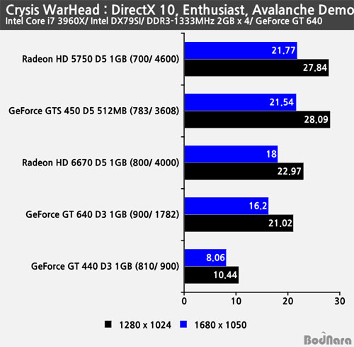 Crysis WarHead´Â °í»ç¾çÀ» ¿ä±¸ÇÏ´Â °ÔÀÓ ÁßÀÇ Çϳª·Î ¸Þ¸ð¸® ¹ö½º¿Í ¸Þ¸ð¸® ´ë¿ªÆø µî¿¡ ¿µÇâÀ» ¹ÞÀ¸¸ç, À̹ø Å×½ºÆ®´Â DirectX 10°ú Enthusiast ±×·¡ÇÈ ¼³Á¤À» Àû¿ëÇØ ÁøÇàÇß´Ù.