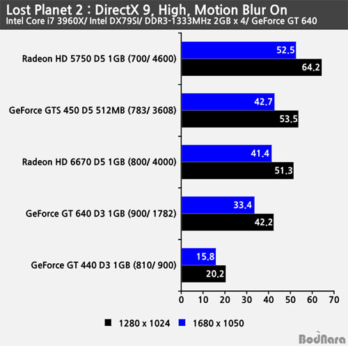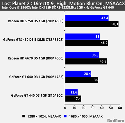 ·Î½ºÆ® Ç÷¡´Ö 2 (Lost Planet)´Â DirectX 9 ¹× High ±×·¡ÇÈ ¿É¼Ç, ¸ð¼Ç ºí·¯ OnÀ» Àû¿ëÇÑ °á°ú ÁöÆ÷½º GTS 450 ¹× ¶óµ¥¿Â HD 6670°ú´Â ÇÁ·¹ÀÓÀÇ Â÷À̰¡ Å« °ÍÀ¸·Î È®ÀεȴÙ.