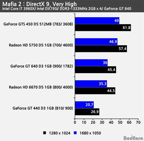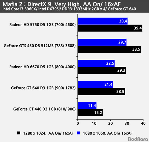 Mafia 2 °ÔÀÓÀº DirectX 9 ȯ°æ°ú Very High, PhysX Off ±×·¡ÇÈ ¿É¼ÇÀ» Àû¿ëÇØ Å×½ºÆ®¸¦ ÁøÇàÀ¸¸ç, ÁöÆ÷½º GT 640Àº AA/ AF ¹ÌÀû¿ë½Ã ¶óµ¥¿Â HD 6670º¸´Ù ±Ù¼ÒÇÏ°Ô ³ôÀº ÇÁ·¹ÀÓÀ» Á¦°øÇß´Ù. ±×·¯³ª AA/ AF Àû¿ë½Ã¿¡´Â ¶óµ¥¿Â HD 6670ÀÌ ÁöÆ÷½º GT 640À» ±Ù¼ÒÇÏ°Ô ¾Õ¼ ¼·ÎÀÇ ¼º´ÉÀº Å« Â÷À̰¡ ¾ø´Ù.