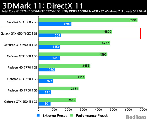 ´ÙÀÌ·ºÆ®X 11 ȯ°æ¿¡¼ÀÇ ¼º´É ºñ±³´Â 3DMark 11À» »ç¿ëÇÏ¿© °á°ú¸¦ µµÃâÇØº¸¾Ò´Ù. È®ÀÎ °á°ú °¶·°½Ã ÁöÆ÷½º GTX 650 Ti GC´Â ·¹ÆÛ·±½º Á¦Ç°°ú ÇÔ²² ÁöÆ÷½º GTX 560º¸´Ù ³ôÀº Á¡¼ö¸¦ ±â·ÏÇÏ¿© ´ÙÀÌ·ºÆ®X 10 ȯ°æº¸´Ù ¿ì¼¼ÇÔÀ» µå·¯³»¾ú´Ù.