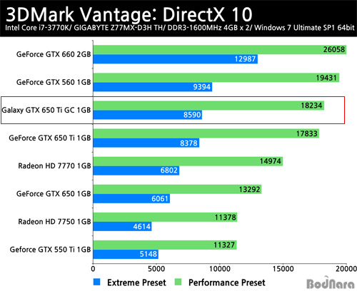 ´ÙÀÌ·ºÆ®X 10 ȯ°æ¿¡¼ÀÇ ¼º´ÉÀ» ºñ±³ÇÒ ¼ö ÀÖ´Â 3DMark Vantage¸¦ ÅëÇØ Å×½ºÆ®¸¦ ½Ç½ÃÇÑ °á°ú Extreme PresetÀ» ±âÁØÀ¸·Î ÇßÀ» ¶§ °¶·°½Ã ÁöÆ÷½º GTX 650 Ti GC´Â °æÀï Á¦Ç°ÀÎ ¶óµ¥¿Â HD 7770º¸´Ù ¾à 20.8%, ÁöÆ÷½º GTX 650º¸´Ù´Â 29.5% ³ôÀº Á¡¼ö¸¦ ±â·ÏÇÏ¿© Å« Â÷À̸¦ º¸¿´´Ù.