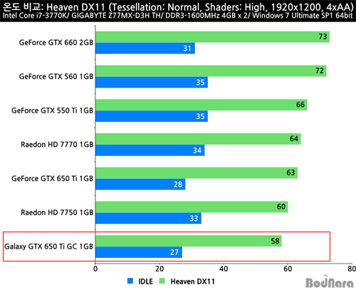 Å×½ºÆ® °á°ú °¶·°½Ã ÁöÆ÷½º GTX 650 Ti GC´Â ÃÖ°í ¿Âµµ·Î 58¡É¸¦ ±â·ÏÇÏ¿© ºñ±³ ´ë»ó Áß Á¦ÀÏ ³ªÀº ¹ß¿ ÇØ¼Ò ´É·ÂÀ» º¸¿´À¸¸ç, ƯÈ÷ ·¹ÆÛ·±½º Á¦Ç°¿¡ ºñÇØ¼µµ 5¡É °¡·® ³·Àº ¿Âµµ¿©¼ ÀÚü ±Ô°ÝÀÇ Ä𸵠¼Ö·ç¼ÇÀÇ È¿À²¼ºÀ» ÀÔÁõÇÏ¿´´Ù.