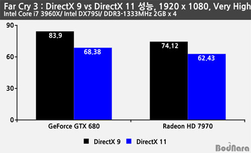 ÇÏÀÌ¿£µå ±×·¡ÇÈÄ«µåÀÎ ÁöÆ÷½º GTX 680°ú ¶óµ¥¿Â HD 7970À» ÀÌ¿ëÇØ DirectX 9¿Í DirectX 11 ¸ðµåÀÇ ÇÁ·¹ÀÓ Â÷À̸¦ ºñ±³Çߴµ¥ ÁöÆ÷½º GTX 680 ´ëºñ ¶óµ¥¿Â HD 7970ÀÇ ÇÁ·¹ÀÓ °ÝÂ÷°¡ Á¶±Ý ´õ ÀûÀº °ÍÀ¸·Î È®ÀεȴÙ. ÆÄÅ©¶óÀÌ 3´Â ±âº»ÀûÀ¸·Î DirectX 11 ¸ðµå¸¦ ÀÌ¿ëÇØ Å×½ºÆ®¸¦ ÁøÇàÇߴµ¥ ¸¸Á·½º·¯¿î ÇÁ·¹ÀÓÀÌ Á¦°øµÇÁö ¾Ê´Â´Ù¸é DirectX 9 ¸ðµå¸¦ ÀÌ¿ëÇØ Ç÷¹ÀÌÇÏ´Â °Íµµ ÇÑ ¹æ¹ýÀÌ´Ù.