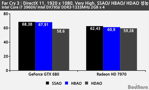 SSAO ¹æ¹ý ¼³Á¤¿¡ µû¸¥ ¼º´ÉÀº ÇÏÀÌ¿£µå ÁöÆ÷½º GTX 680°ú ¶óµ¥¿Â HD 7970À» ÀÌ¿ëÇØ ºñ±³ÇßÀ¸¸ç SSAO¿Í HBAO´Â ¾ç ±×·¡ÇÈÄ«µå¿¡¼ Å« ÇÁ·¹ÀÓ Â÷À̰¡ ¹ß»ýÇÏÁö ¾Ê¾Ò´Ù. ±×·¯³ª ÁöÆ÷½º GTX 680Àº ¶óµ¥¿Â HD 7970°ú ºñ±³ÇØ HDAO Àû¿ë½Ã ÇÁ·¹ÀÓ ÀúÇϰ¡ »ó´ëÀûÀ¸·Î Å©°Ô ¹ß»ýÇß´Ù.