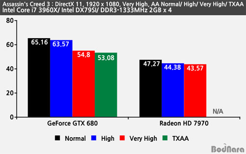AA ¼³Á¤º°·Î 1920x1080 ÇØ»óµµ¿¡¼ AMD ¶óµ¥¿Â HD 7970°ú ¿£ºñµð¾Æ ÁöÆ÷½º GTX 680À» ±âÁØÀ¸·Î Å×½ºÆ®¸¦ ÁøÇàÇÑ °á°ú ÈÄó¸® ¾ÈƼ¾Ù¸®¾î½ÌÀÎ FXAA¸¦ Àû¿ëÇÏ´Â °ÍÀ¸·Î ¾Ë·ÁÁø High´Â ±âº»ÀÎ Normal°ú ºñ±³ÇØ ¾ç»ç ¸ðµÎ 2-3fps ³»¿Ü·Î ÇÁ·¹ÀÓ Ç϶ôÆøÀÌ ³ôÁö ¾Ê¾Ò´Ù. ÀÌ´Â ÈÄó¸® AA ±â¼úÀÎ FXAA°¡ ¾ÈƼ¾Ù¸®¾î½ÌÀ» Àû¿ëÇϸ鼵µ ÇÁ·¹ÀÓ¿¡ Å« ¿µÇâÀ» ÁÖÁö ¾Ê±â ¶§¹®ÀÌ´Ù.