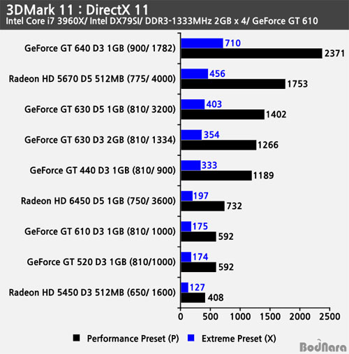 DirectX 11 ȯ°æÀ» Å×½ºÆ®ÇÏ´Â 3DMark 11¿¡¼´Â ÁöÆ÷½º GT 610Àº ±âÁ¸ ÁöÆ÷½º GT 520°ú ½ºÆå ¹× µ¿ÀÛ Å¬·°¿¡ Â÷À̰¡ ¾ø´Â ¸¸Å Â÷ÀÌ ¾ø´Â ¼º´ÉÀ» Á¦°øÇßÀ¸¸ç ¶óµ¥¿Â HD 6450 GDDR5 ¹öÀü¿¡´Â ¸ø¹ÌÄ¡´Â ¼º´ÉÀ» Á¦°øÇÑ´Ù.