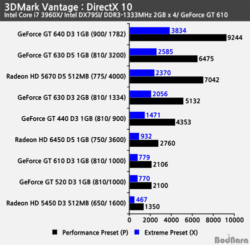 3DMark Vantage´Â DX10 ȯ°æ Å×½ºÆ®Çϸç ÃÖ±ÙÀÇ º¸±ÞÇü Á¦Ç°±ºÀº DirectX 11±îÁö Áö¿øÇϰí ÀÖ¾î ¸ðµç Å×½ºÆ®°¡ °¡´ÉÇÏ´Ù. ±×·¯³ª ÁöÆ÷½º GT 610À» Æ÷ÇÔÇÑ °æÀï Á¦Ç°Àº ¼º´ÉÀ» ³ôÀ̰í ÀÖ´Â ÀÎÅÚ°ú AMD ³»Àå ±×·¡ÇÈ¿¡ µû¶óÀâÈ÷°í ÀÖ´Ù.