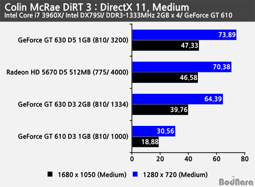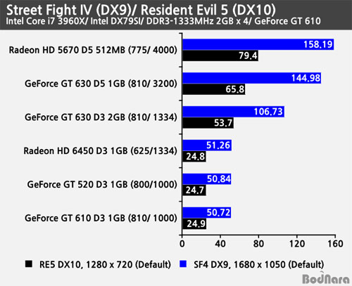 DX9¸¦ Å×½ºÆ®ÇÏ´Â ½ºÆ®¸®Æ® ÆÄÀÌÅÍ 4 (Street Fight IV)¿Í DX10À» Å×½ºÆ®ÇÏ´Â ·¹Áö´øÆ® À̺í 5¸¦ ÀÌ¿ëÇØ ÁöÆ÷½º GT 610À» Æ÷ÇÔÇÑ º¸±ÞÇü Á¦Ç°±ºÀÇ ¼º´ÉÀ» ºñ±³Çß´Ù. ÁöÆ÷½º GT 610Àº °°Àº DDR3 ±â¹ÝÀÇ ¶óµ¥¿Â HD 6450 Á¦Ç°°ú´Â °ÅÀÇ µ¿±ÞÀÇ ¼º´ÉÀ» ³»ÁÖ°í ÀÖ´Â °ÍÀ¸·Î È®ÀεȴÙ.
