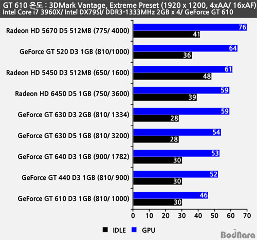 NVIDIA GeForce GT 610 (810/ 1000) NVIDIA GeForce GT 640 1GB D3 1GB (900/ 1782) NVIDIA GeForce GT 630 1GB (810/ 1334) NVIDIA GeForce GT 440 D5 1GB (810/ 900) NVIDIA GeForce GT 520 D3 1GB (810/ 1000) AMD Radeon HD 5670 512MB Ref. (775/ 4000) AMD Radeon HD 6450 D5 1GB Ref. (750/ 3600) AMD Radeon HD 5450 D3 512MB Ref. (650/ 1600)