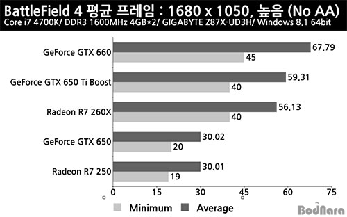 ¹Ý¸é, 1680 x 1050 ÇØ»óµµ¿¡¼ '³ôÀ½' ÇÁ¸®¼ÂÀ» Àû¿ëÇÒ °æ¿ì ÁöÆ÷½º GTX 650 Ti Boost¿Í ¶óµ¥¿Â R7 260X°¡ Æò±Õ 60ÇÁ·¹ÀÓ¿¡ °¡±î¿î ¼º´É°ú, ÃÖ¼Ò ÇÁ·¹ÀÓµµ 40ÇÁ·¹ÀÓÀ¸·Î ¾ÈÁ¤Á¤ÀÎ ¼º´ÉÀ» º¸¿© °ÔÀÓ Ç÷¹ÀÌ¿¡ ÁöÀå¾ø´Â ¼º´ÉÀ» Á¦°øÇÑ´Ù.