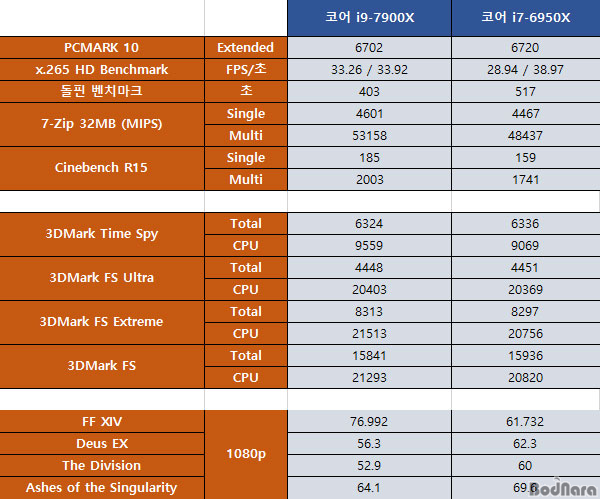 Áö±Ý±îÁö »ìÆìº» Å×½ºÆ® °á°ú¸¦ Á¾ÇÕÇÑ´Ù¸é ÄÚ¾î i9-7900X´Â ¸Þ½¬ ¾ÆÅ°ÅØÃ³·Î ÄÚ¾î ¿©·¯ °³¸¦ ÀÌÀü ¼¼´ë Á¦Ç°ÀÎ ÄÚ¾î i7-6950Xº¸´Ù