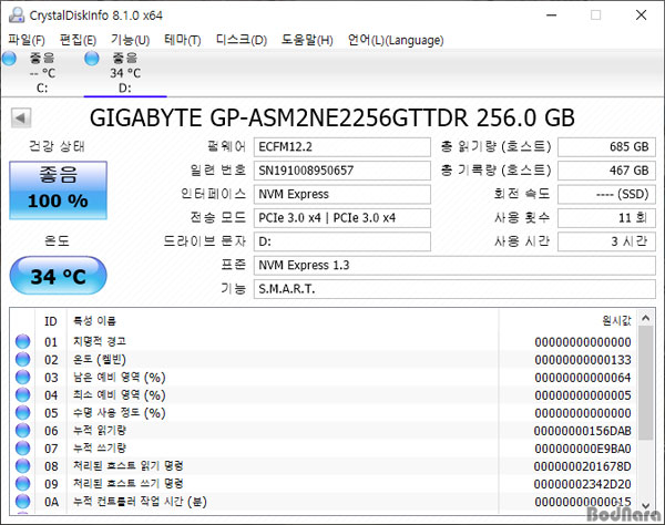 ½Ã½ºÅÛÀ» ±¸¼ºÇß´Ù. CrystalDiskInfo¿¡¼ ÇØ´ç SSD°¡ PCIe 3.0 x4 ÀÎÅÍÆäÀ̽º¿Í NVMe 1.3 ÇÁ·ÎÅäÄÝÀ» Áö¿øÇÏ´Â °ÍÀ»