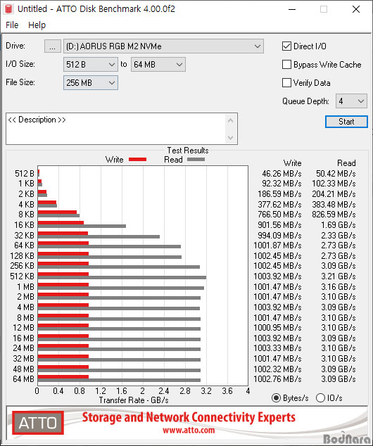 ATTO µð½ºÅ© º¥Ä¡¸¶Å© °á°ú¸¦ º¸¸é AORUS RGB M.2 NVMe SSD 256GBÀÇ ¿¬¼Ó Àб⠼ӵµ´Â ÃÖ´ë 3,100MB/s, ¿¬¼Ó