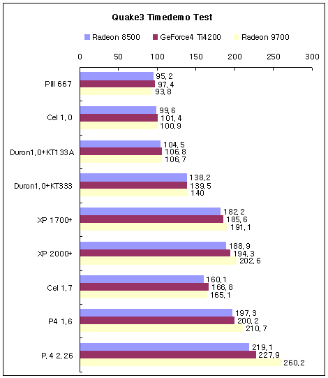 Quake3 ¿ª½Ã 3DMark2001se¶§¿Í ¸¶Âù°¡ÁöÀÇ °á°ú¸¦ º¸ÀδÙ. Duron°ú AthlonXP»çÀÌÀÇ ±Þ°ÝÇÑ º¯È­, Radeon9700ÀÇ P4 2.26»óÅ¿¡¼­´Â ±Þ°ÝÇÑ ¼º´É»ó½ÂÀÌ ´«¿¡¶è´Ù.