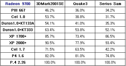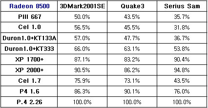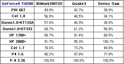 ¿ª½Ã³ª °í¼º´É ±×·¡ÇÈÄ«µå¿¡¼­´Â ½Ã½ºÅÛÀÇ ¿µÇâÀ» ¸¹ÀÌ ¹Þ´Â´Ù. °¡Àå Å« ÆøÀÇ º¯È­°¡ ÀÎÅÚ°è¿­ÀÇ °æ¿ì Cel 1.7°ú P4 1.6»çÀÌ¿¡¼­, AMD °æ¿ì Duron°ú AthlonXP»çÀÌ¿¡¼­ ³ªÅ¸³µ´Âµ¥, À̷κ¸¾Æ °í¼º´ÉÀÇ ±×·¡ÇÈÄ«µå´Â °í¼º´É ÇÁ·Î¼¼¼­ÀÏ ¶§ Á¦ ¼º´ÉÀ» ¹ßÈÖÇÑ´Ù°í º¼ ¼ö ÀÖ´Ù. ÀÌ·± ±×·¡ÇÈÄ«µå¸¦ Á¦´ë·Î »ç¿ëÇÏ·Á¸é, Àû¾îµµ P4 1.6ÀÌ»óÀ̳ª XP1700+ÀÌ»óÀ» »ç¿ëÇÏ¿©¾ß ÇÒ °ÍÀÌ´Ù.