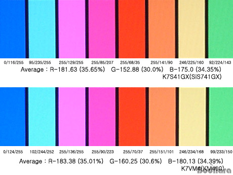 ¸í¾Ïºñ°¡ ¾àÇÑ LCD ¸ð´ÏÅÍ¿¡¼­´Â µÎ °á°ú¹°ÀÇ »ö»ó Â÷À̰¡ Å©°Ô ´«¿¡ ¶çÁö ¾Ê°ÚÁö¸¸, CRT ¸ð´ÏÅ͸¦ ¾²´Â ºÐÀ̶ó¸é ¾î´À Á¤µµ Â÷À̰¡ ´«¿¡ µé¾î¿Ã °ÍÀÌ´Ù. KM400ÂÊÀÌ Á» ´õ ºÎµå·¯¿î »ö°¨À» ¶ç°í ÀÖÀ¸¸ç ¸í¾Ïºñµµ Á» ´õ ³·Àº ´À³¦ÀÌ´Ù. ÀüüÀûÀ¸·Î KM400ÂÊÀÌ ´õ ¹à°í È­»çÇÑ È­¸éÀ» º¸¿©ÁÖ¸ç, K7S41GXÂÊÀÌ ºÓÀº»ö »öÁ¶°¡ ¾à°£ ´õ °­ÇÑ ÆíÀÌ´Ù.