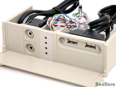 5.25" º£ÀÌ¿¡ È®Àå Æ÷Æ®¸¦ ¸¸µé ¼ö ÀÖ´Â ºÎǰµéÀÌ µé¾îÀÖ´Ù. USB È®Àå Æ÷Æ®¿Í ¿Àµð¿À/¸¶ÀÌÅ© ´ÜÀÚ, ±×¸®°í ½Ã½ºÅÛÀÇ »óŸ¦