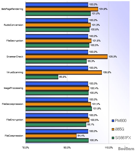 »ç¿ëÇÏÁö ¾ÊÀ» ¶§ÀÇ CPU ¿¬»ê¼Óµµ¿¡ Â÷À̰¡ ¾ø´Ù. SiS661FX¿Í i865G¿¡¼´Â Á¤¼ö ¿¬»ê¿¡ 300MIPS Á¤µµÀÇ ¼Õ½ÇÀÌ