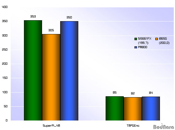 SuperPi¿Í TMPG_EncÀÇ Å×½ºÆ®¿¡¼´Â SiS661FX¿¡ ºñÇØ ¾à°£ ºü¸¥ ¸ð½ÀÀ» º¸À̰í ÀÖ´Ù. ¾à°£ ³·Àº FSB¿¡ µû¸¥ Â÷ÀÌ¿Í
