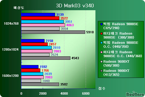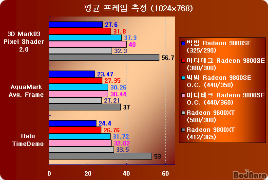 ¡ã ºòºö°ú ¹ÌµðÅ×Å©ÀÇ Radeon 9800SE´Â µÑ ´Ù °³Á¶¸¦ ÇÏÁö ¾ÊÀº »óÅÂÀÇ ±âº» Ŭ·° »ç¿ëÀ» ÀüÁ¦·Î Çϰí Àֱ⠶§¹®¿¡ Ĩ¼Â Äð·¯ÀÇ ¼º´ÉÀÌ ±×¸® ÁÁÁö ¸øÇÏ´Ù.