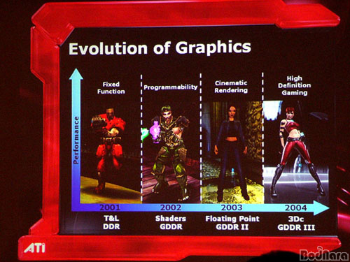 | ±×·¡ÇÈÀÇ ¹ßÀüÀ» º¸¿©ÁÖ´Â µµÇ¥. 2001³âÀÇ T&L ¼¼´ëºÎÅÍ Shader, Floating Point¸¦ Áö³ª ÀÚ»çÀÇ ½Å±â¼ú
