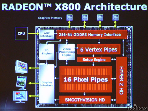 | Radeon X800ÀÇ ¾ÆÅ°ÅØÃĸ¦ ¼³¸íÇÑ ±×¸²µé. X800 ÄÚ¾îÀÇ ³»ºÎ ¾ÆÅ°ÅØÃÄ ±¸¼º¿¡¼ºÎÅÍ GDDR3 ¸Þ¸ð¸®¸¦ »ç¿ëÇÑ