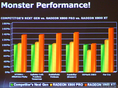 º¸¿©ÁÖ°í ÀÖ´Ù. ATI¿¡¼ Á¦°øÇÑ µµÇ¥¿¡´Â °æÀï»çÀÇ Â÷¼¼´ë Á¦Ç°¿¡ ºñÇØ Radeon X800 Pro´Â ºñ½ÁÇÑ Á¤µµ,
