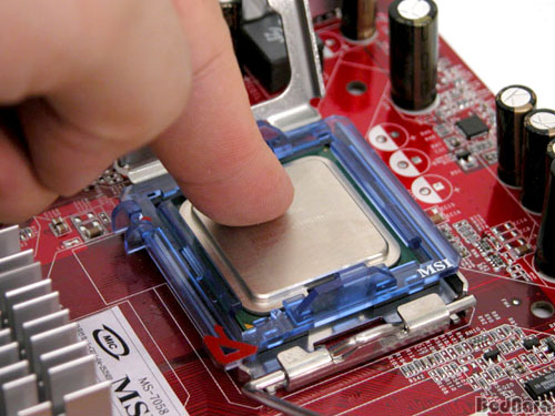 CPU¸¦ °¡À̵忡 ³¢¿î´Ù. LGA775 ŸÀÔÀÇ ÆæÆ¼¾ö4 CPU¿¡ ¹æÇâÀ» Çò°¥¸®Áö ¾Êµµ·Ï »óÇÏ·Î ÀÛÀº ȨÀÌ ³ªÀִµ¥, CPU