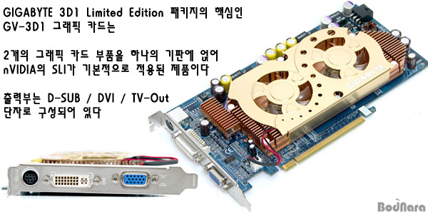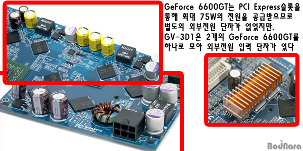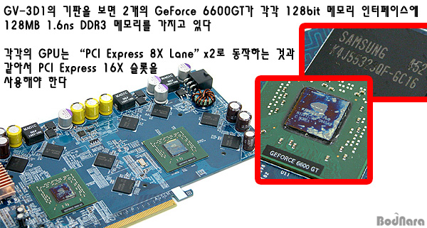 GV-3D1ÀÇ ±¸Á¶¸¦ »ìÆìº¸¸é 2°³ÀÇ GeForce 6600GT°¡ ´Þ·ÁÀÖÀ¸¸ç, ±×·¡ÇÈ Ä¨¼Â´ç °¢°¢ 128bit ¸Þ¸ð¸® ÀÎÅÍÆäÀ̽º¸¦ °¡Áø DDR ¸Þ¸ð¸® 128MB¾¿ÀÌ ´Þ·ÁÀÖ´Ù. GIGABYTE¿¡¼´Â À̸¦ 256bit ¸Þ¸ð¸® ÀÎÅÍÆäÀ̽º¿¡ 256MB ¸Þ¸ð¸®¶ó°í ÇÏÁö¸¸ ½ÇÁ¦·Î´Â Á¤È®È÷ ±×·¸´Ù°í ¸»ÇÏ±ä ¾î·Æ°í, µû·Îµû·Î µ¿ÀÛÇÏ´Â GPU¿Í ¸Þ¸ð¸®°¡ ÇϳªÀÇ ±âÆÇ¿¡ ¿Ã¶ó¿Â ¼ÀÀÌ´Ù.