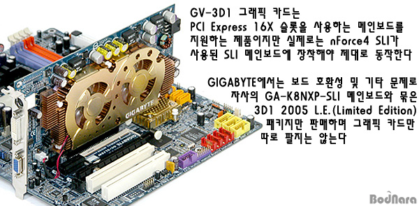±×·¯³ª SLI ¸ðµå ÀÚü°¡ nForce4 SLI Ĩ¼ÂÀ» »ç¿ëÇÑ ¸ÞÀκ¸µå¿¡¼ Á¤»óµ¿ÀÛÇϵµ·Ï nVIDIA°¡ µå¶óÀ̹ö¿¡ Á¦ÇÑÀ» °É¾îµÎ¾ú±â ¶§¹®¿¡ ÇöÀç´Â nForce4 SLI ¸ÞÀκ¸µå¿¡¼¸¸ »ç¿ëÇÒ ¼ö ÀÖ´Ù. ±×·±µ¥ GIGABYTE¿¡¼´Â GV-3D1ÀÇ È£È¯¼ºÀ̳ª ¼º´É ¹®Á¦·Î ÀÚ»çÀÇ ¸ÞÀκ¸µå¿¡¼¸¸ »ç¿ëÇϵµ·Ï 3D1 2005 L.E.¶ó´Â ÆÐŰÁö¸¦ ¸¸µé¾ú´Âµ¥ À̰ÍÀÌ ¿ÇÀºÁö´Â µÚÀÇ Å×½ºÆ®¿¡¼ Á¡°ËÇØº¼ °ÍÀÌ´Ù.